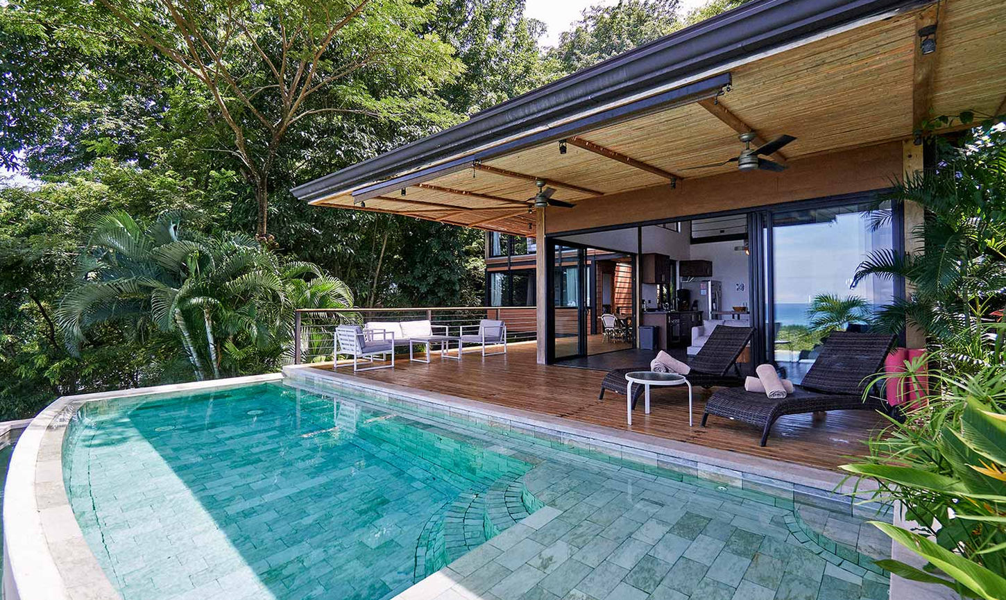 Villa Ebony features a semi-open planned design with generous indoor and outdoor living and dining spaces. With four spacious bedrooms in the house. 4 king beds, 4 bath + outdoor shower This boutique villa is positioned in the lush Costa Rican jungle and offers stunning views of the most amazing playa Santa Teresa . There is a fully fitted kitchen, A/C in all bedrooms, Wi-Fi, a sound system and , a dining table that seats up to ten people, There are several comfortable spaces in which to relax or entertain, soaking up the sunshine or swinging in a hammock. Watching closely monkeys, birds, and iguanas, coupled with a front row seat to Costa Rica’s epic wilderness. If you are after a jaw-dropping panoramic view and unmatched privacy, Villa Ebony won't disappoint you.